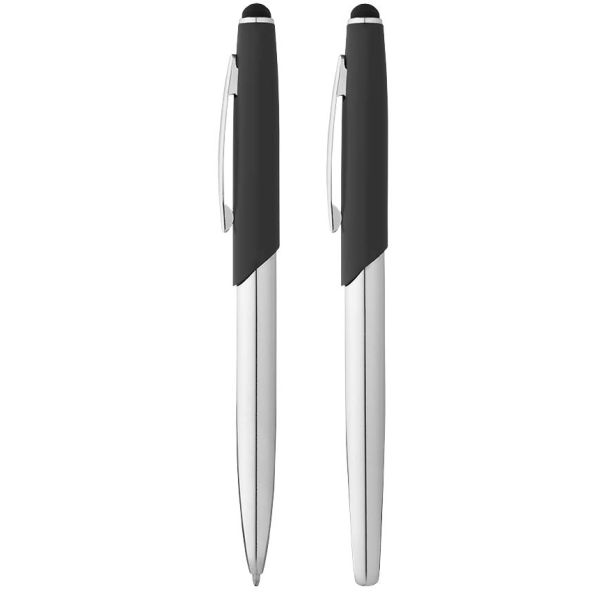 Geneva stylus ballpoint pen and rollerball pen gift. Sophisticated silhouette stylus ballpoint pen and rollerball pen featuring a matte upper barrel with shiny chrome lower barrel and matching chrome details in Avenue sliding pen gift box (size: 16.9 x 5.2 x 2cm). Metal.