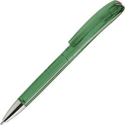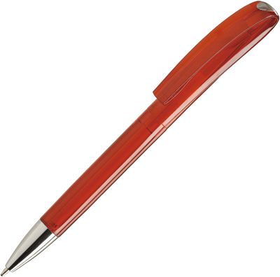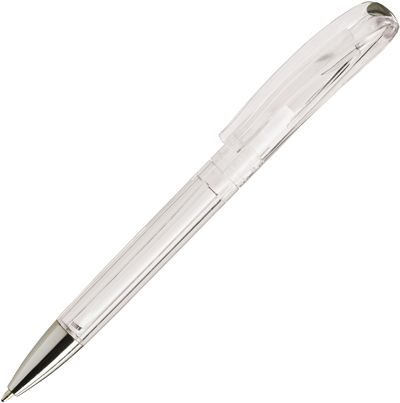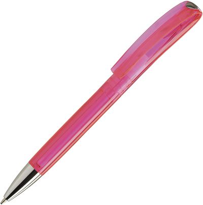 A twist action ball pen in a range of translucent colours and a solid white with chrome accents.