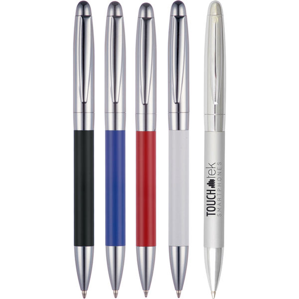 A weighty twist action ball pen with two tone chrome accents and a great print area to the lower barrel.