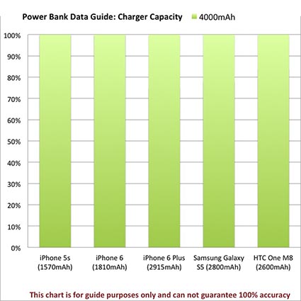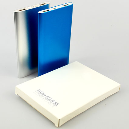 The Titan Powerbank portable battery chargers offer emergency power to your device on the go with a high capacity 4000mAh battery. Lightweight, slimline aluminium casing with a choice of 5 colours. Complete with 4 lights and a multi-function on/off button to show the capacity status as well as turn charging on/off. These personalised portable chargers boast dual USB output ports, one 1A designed for smartphones and similar devices, the other a 2A port designed for quickly (and safely) charging a tablet. Please view the guide chart on how much a power bank will charge some example phones. Plug your device into this travel charger using the USB cable supplied with your device (not supplied with this charger) to give it that extra boost of power. Supplied in a light gift box as standard.