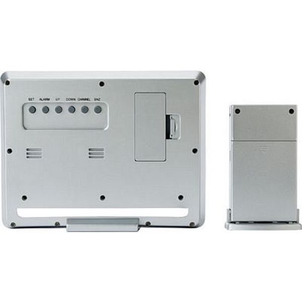 Weather station with forecast function, radio controlled clock, outdoor thermometer, indoor hygrometer, perpetual calendar, snooze alarm clock, 12/24 hour time display, hygro- and thermometer and outside sensor.