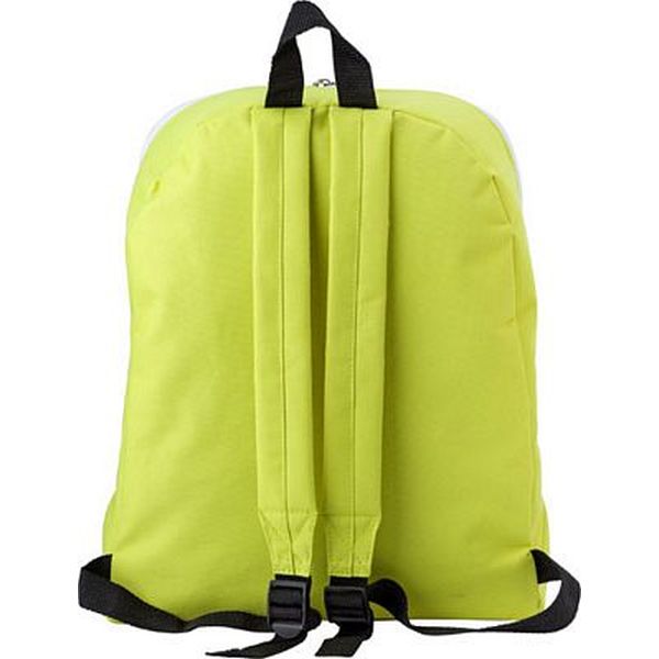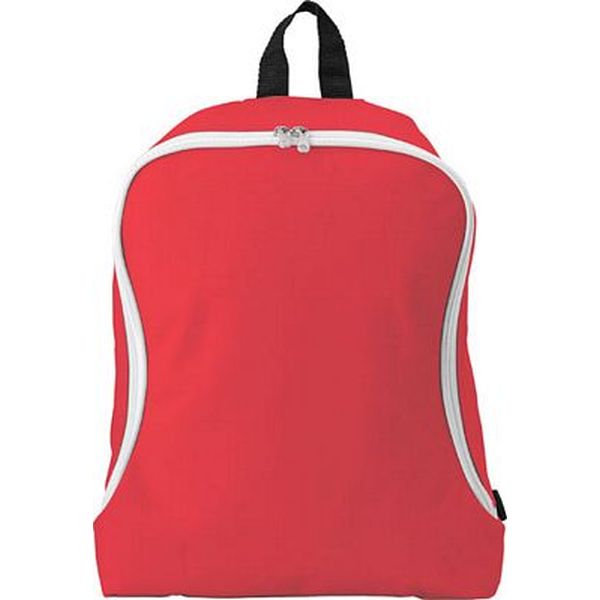 Polyester backpack with a zipped large compartment, a nylon carrying loop and two adjustable carry straps.