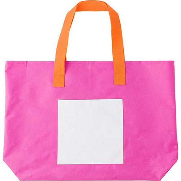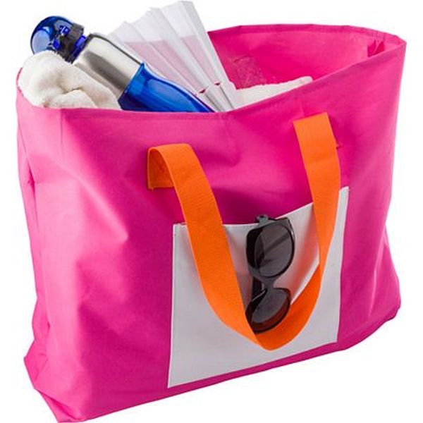 Polyester 600D bright coloured beach bag with one white front pocket and two carrying handles.