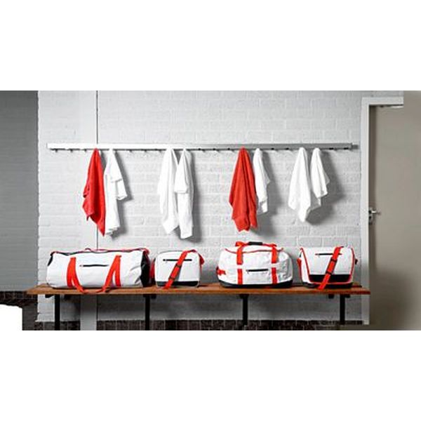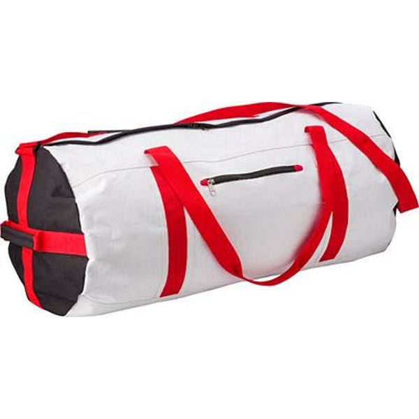 Polyester 600D large capacity barrel sports/travel bag with a large main zipped compartment and front zipped pocket, two carry handles and an adjustable shoulder strap.