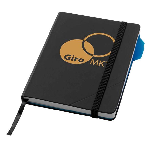 Alpha Notebook II. Exclusive design notebook (80 sheets/80 gsm lined white paper) incl. black ribbon marker, a blue page divider with black elastic band closure and small pocket inside of the back cover. The page divider holds small notes and the small pocket inside holds business cards. The notebook comes with an extra booklet (16 sheets/ 80 gsm blank white paper) for making separate notes or calculations. Incl. Marksman gift box. Cardboard.