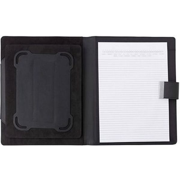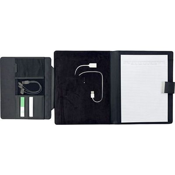 A4 PU Folder with magnetic closing, a large internal pocket for a tablet, an elastic pocket for a smart phone, two rubber bands for USB sticks, five pockets for business cards. Includes a 4000 mAh power bank with three plugs; USB, micro USB, and a 20 page note book and pen loop.