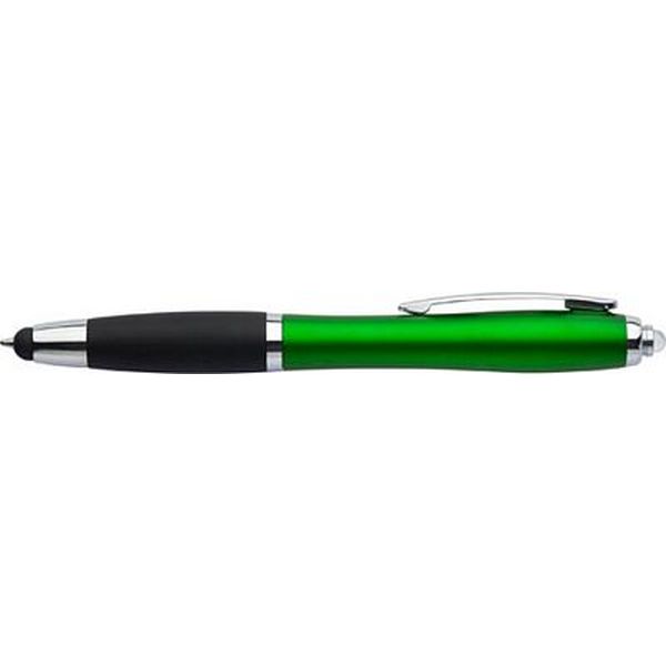 Plastic ballpen with a soft rubber grip, blue ink, metal clip, a stylus suitable for capacitive screens and a small light.