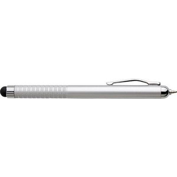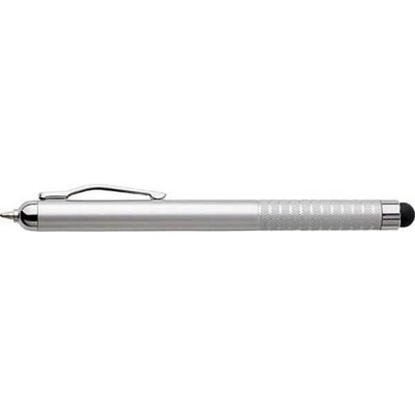 Plastic metallic coloured effect ballpen with black ink and a stylus suitable for capacitive screens.
