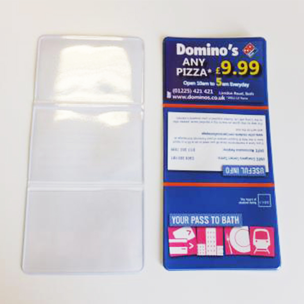 Trifold Travel Wallet made from 350mic smoothcalf PVC with clear three clear 180mic PVC internal pockets. Can be printed in full colour on white only.