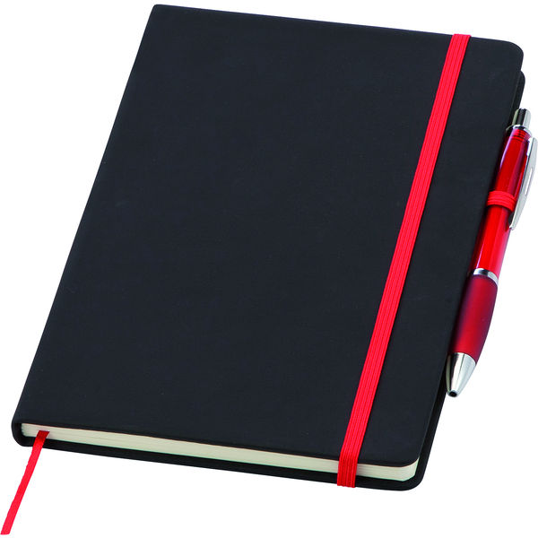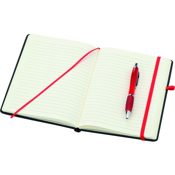 A super stylish new notebook with a soft-feel hardbacked black cover, with contrasting coloured elasticated strap and page marker. The notebook is available in a choice of four colours with a matching coloured promotional ballpen. Prices include our bestselling Curvy Ballpen; printed one colour to both cover and pen. For a more premium promotion we can offer our metal Reno pen with selected colour options (at an extra cost - please enquire)