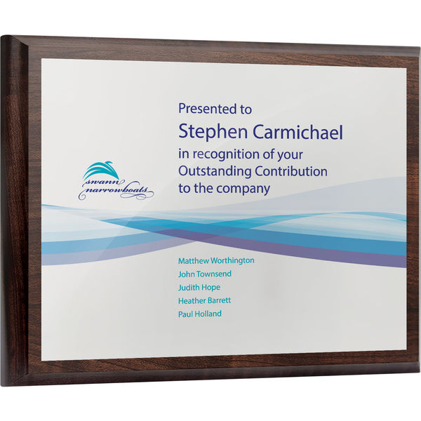 UK Manufactured real metal faced plaques with quality veneered bases and full colour digital print. Size 6X8. Choice of metal face and base colours / finishes. Wide choice of larger sizes and different shapes available at additional cost.