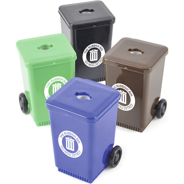 Plastic wheelie bin shaped single pencil sharpener.