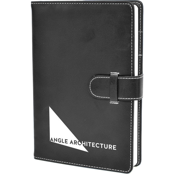 A5 PU notebook with stitching detail along the edges and the close tab. Notebook contains 400 lined pages. Includes a ribbon bookmark and a pen holder.