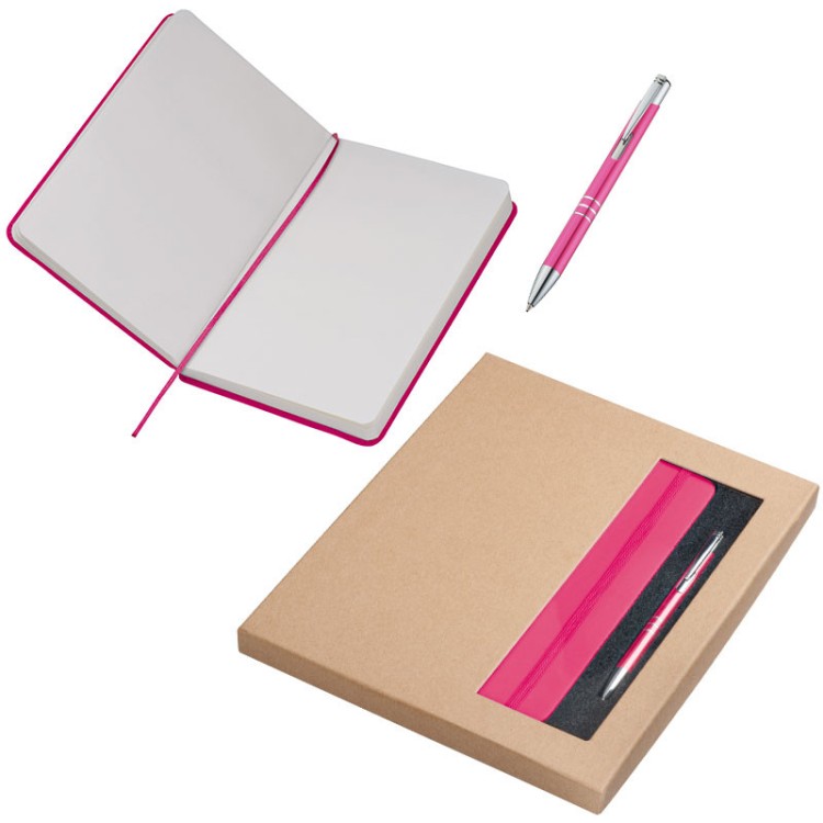 A5 Notebook & Ball Pen Set, complete with presentation box. 160 plain paper pages, bookmark, with aluminium ball pen with blue ink.