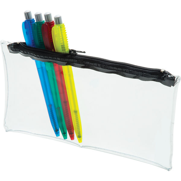 0.3mm thick clear PVC pencil case with coloured zip. Suitable for student exams. Pens not included.