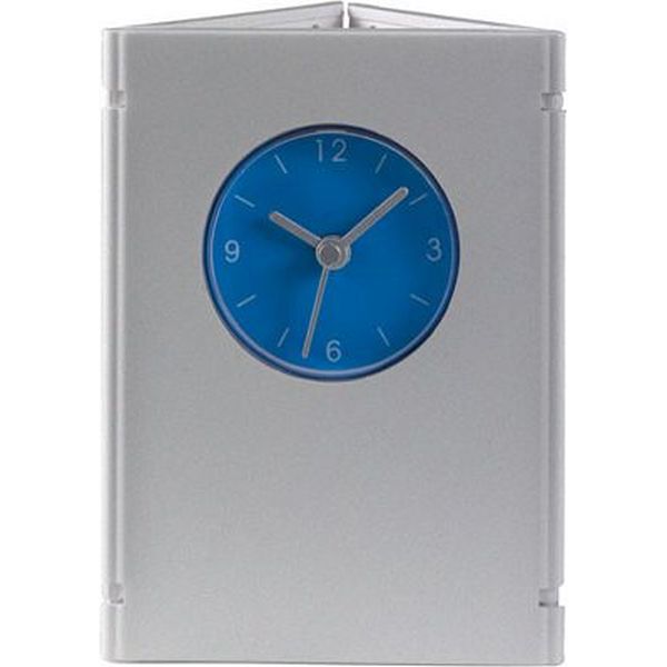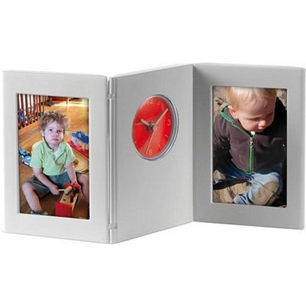 Folding plastic desk clock, pen holder and two photo frames with a 44.5mm x 74.9mm photo size.