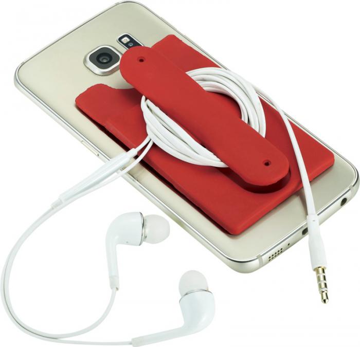 Silicone phone wallet with stand. This soft protective silicone wallet with adhesive tape can be easily attached on the back of your phone and holds 2 to 3 credit cards and/or ID cards. It can also be used as a phone stand, grip or cable tidy.
