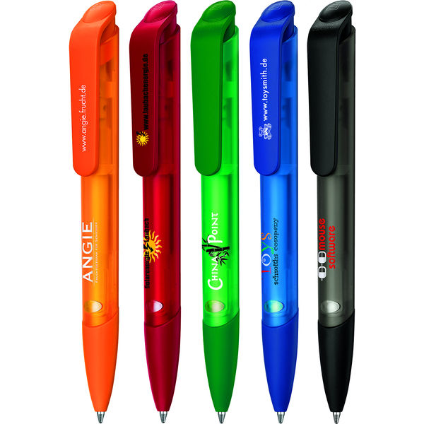 Retractable ballpen with matt translucent barrel large soft grip section and large volume plastic clip. Fitted with a blue plastic G2 super large capacity refill.