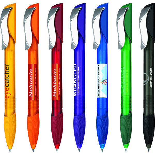 Innovative design with translucent barrel colours, matching soft feel grip and a chrome clip. Large capacity blue ink refill.