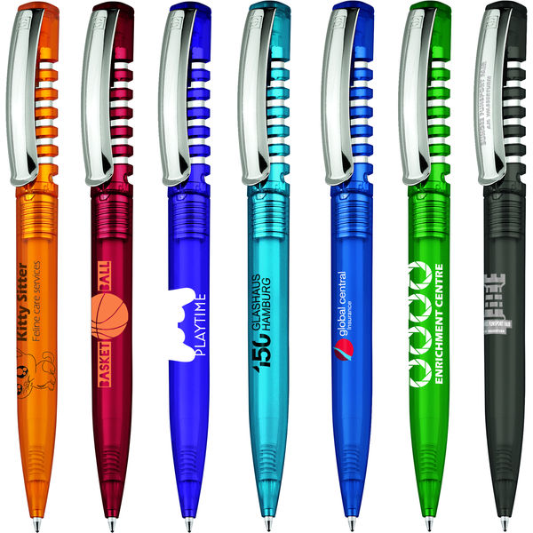 Award winning design. Unique patented spring push-cap with translucent barrel curved chrome clip and matching inner. Large capacity black ink refill.