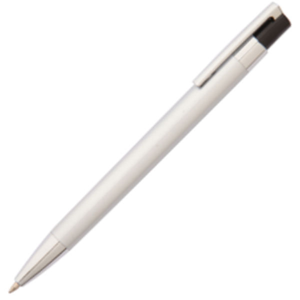 Plastic barrel pen with push-button and metal clip silver tip and trim. Stylish yet cost effective with large print area. Black ink refill