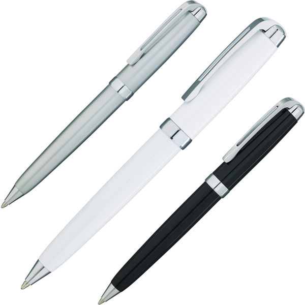 A well balanced metal twist action ballpen with a hinged clip. Black and blue versions can be offered engraved to mirror chrome finish (extra).