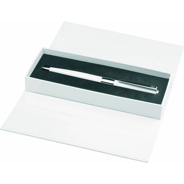 Puristic metal rollerball in matt black finish with gunmetal trim or gloss white finish and high-shine chrome trim. Fitted with a metal safety roller refill in blue ink.