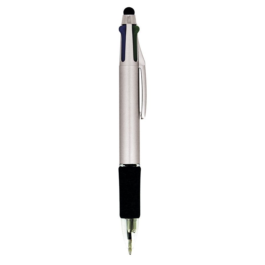 5-in-1 multi-function ballpoint pen: 4 different inks and a stylus! Opaque coloured barrel, transparent ring and section, and black rubberised grip.