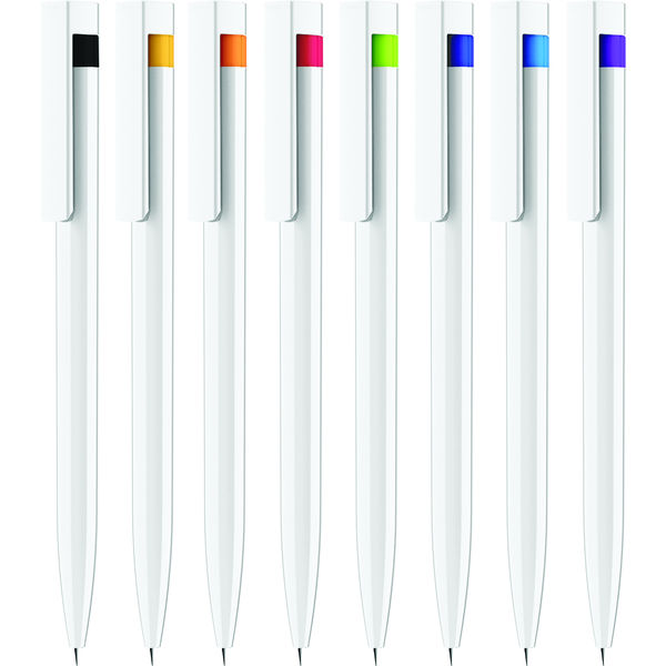Opaque high-gloss finish barrel and clip in white, with transparent high-gloss mid in one of 8 popular colours. Fitted with large capacity refill. Now available with our HD Digital print for unlimited colours and gradients. ON SPECIAL OFFER UNTIL 30/07/2016