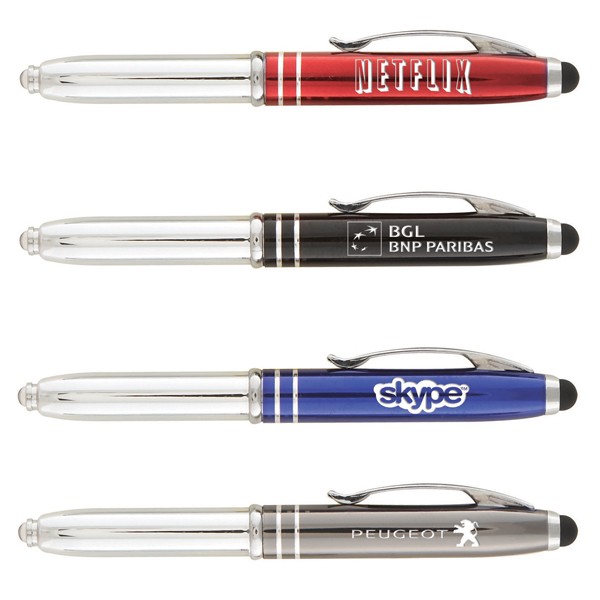 Stylish stylus pen with LED light on the opposite end. Shiny anodised finish. Silicone nib on the top of the cap useful for all touch pads and smartphones. Supplied with black writing ink.