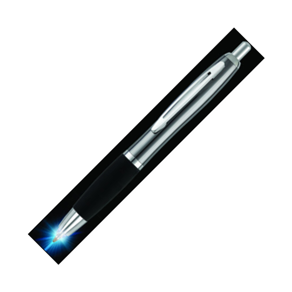 Quality metal ballpen with a soft rubberised grip and chrome trim. Pen nib illuminates when push-button is operated perfect for writing in low light conditions. Suitable for printing and engraving - silver finish appears when engraved.