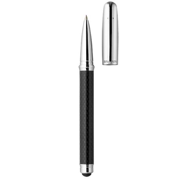 Stylus rollerball pen. Traditional handcraft meets modern technology through this sleekly designed carbon fibre pen that incorporates both a quality rollerball pen and a stylus tip for touch screen devices. Incl. Balmain gift box (18 x 16.3 x 3 cm). Metal.