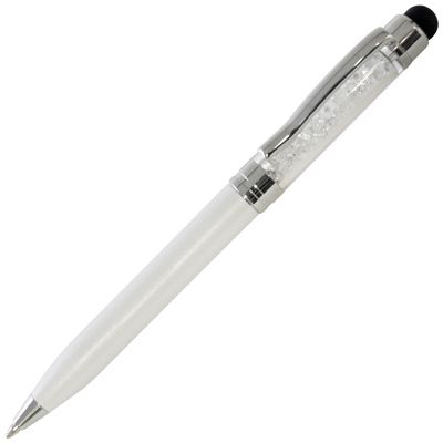 A mid size, twist action ball pen with soft stylus and stunning crystals in the top transparent barrel section.