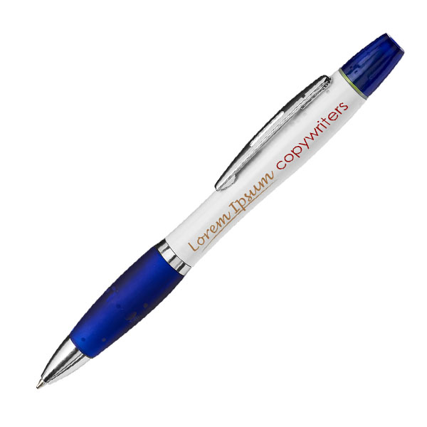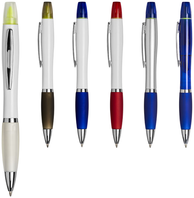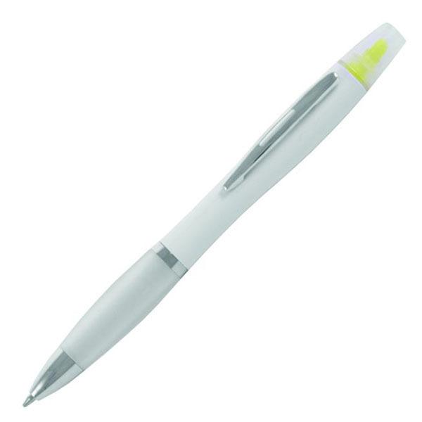 Bestselling Curvy Ballpen but with a funky yellow highlighter at the top! A great dual-purpose product it offers a massive branding area for both standard pad print and full colour digital print along with a selection of popular colour trim options. Pen is supplied with black ink.