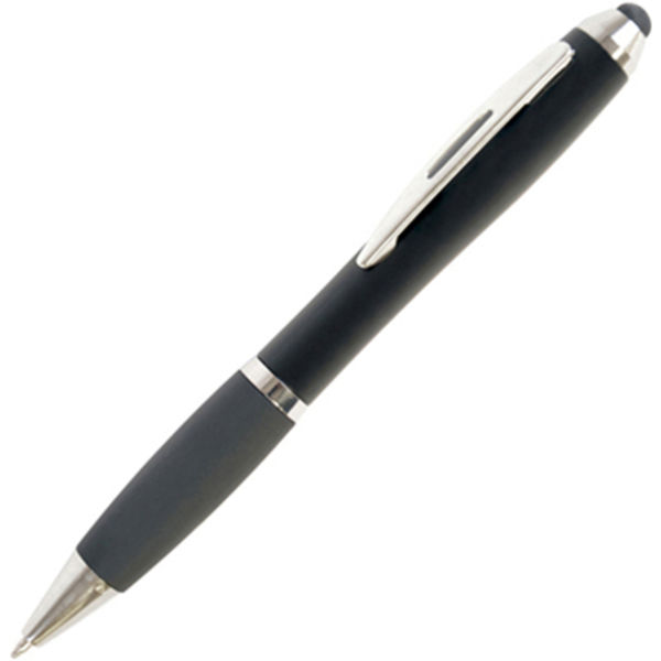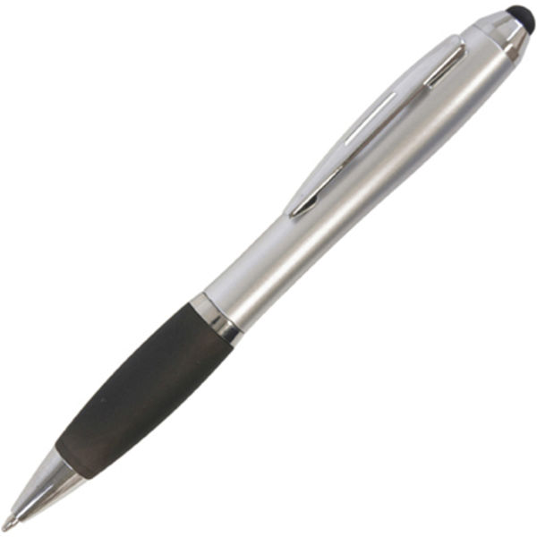 An attractive curvy twist action ball pen with a matching soft stylus silver end piece for that dual functionality!