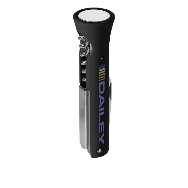 Flow waitress knife. A handy and easy-to-grip waitress knife designed and equipped with a foil cutter that slides out of the handle and a stable corkscrew with lever that easily removes bottle corks. Exclusive design. Presented in an Avenue gift box. ABS plastic and stainless steel.