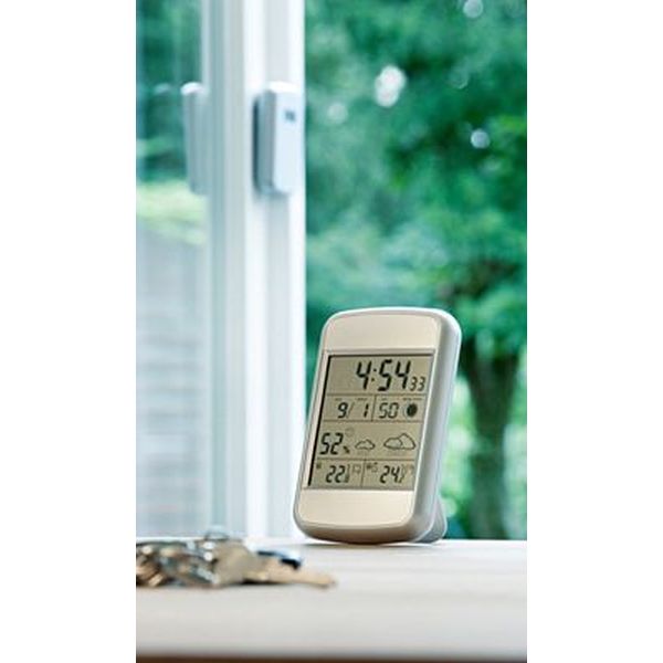 Plastic weather station with a sensor for using outside, clock, moon phase and weather forecast. Batteries included.