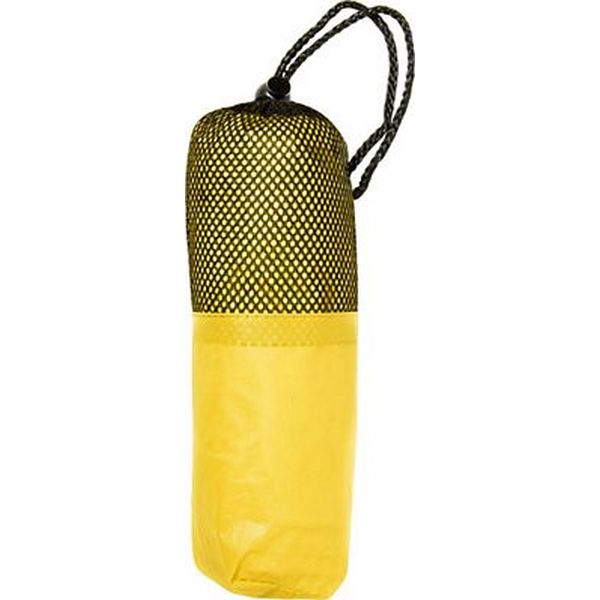 Poncho with hood, made from 12mm PEVA, open size approximately 100 x 120 cms. Supplied in a matching pouch with black nylon mesh and cord closure.