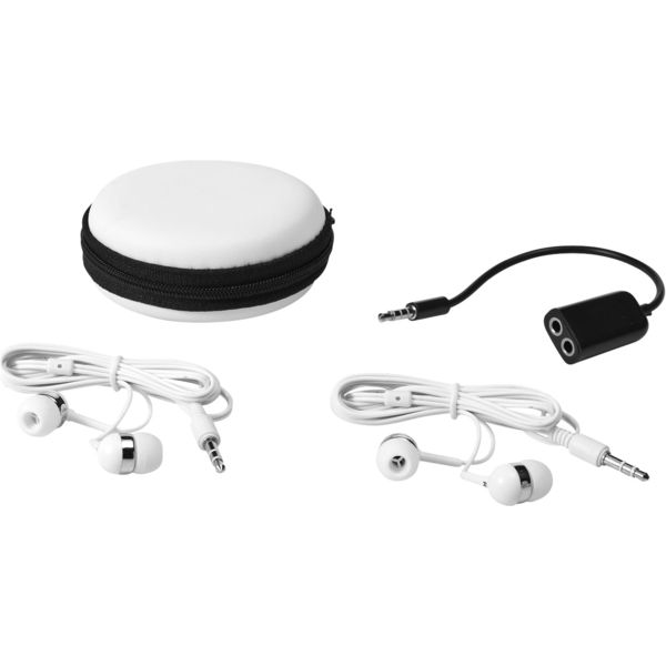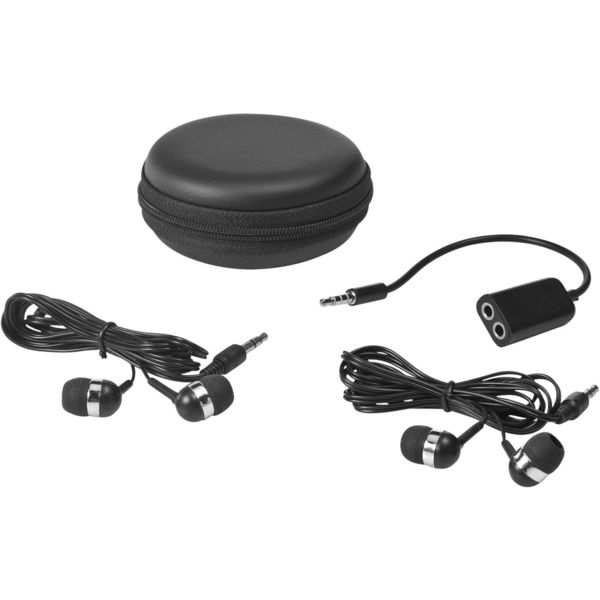 The perfect travel accessory! This kit includes two sets of earbuds, a music splitter and EVA case. Allows two people to listen to the same audio device at the same time with their own set of earbuds. Can be used on smartphones, tablets and all music players with a 3.5 mm audio jack. Cable length: 110 cm. ABS plastic and EVA case.