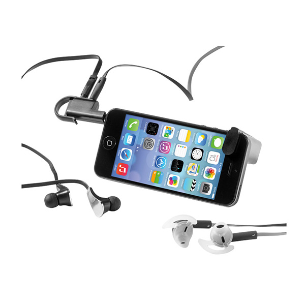 Multifunctional phone accessory with a music splitter and phone stand function. The detachable splitter allows two people to listen to the same audio device with their own set of earbuds. Can be used on smartphones, tablets and all other music players with a 3.5 mm audio jack. The phone stand adjusts itself to any size phone and has an improved grip with the integrated rubber pads. Easily clip this item to your keychain or travel accessory with the integrated Click & Go system. Packed in a Marksman gift box. Exclusive Design. Aluminium and ABS