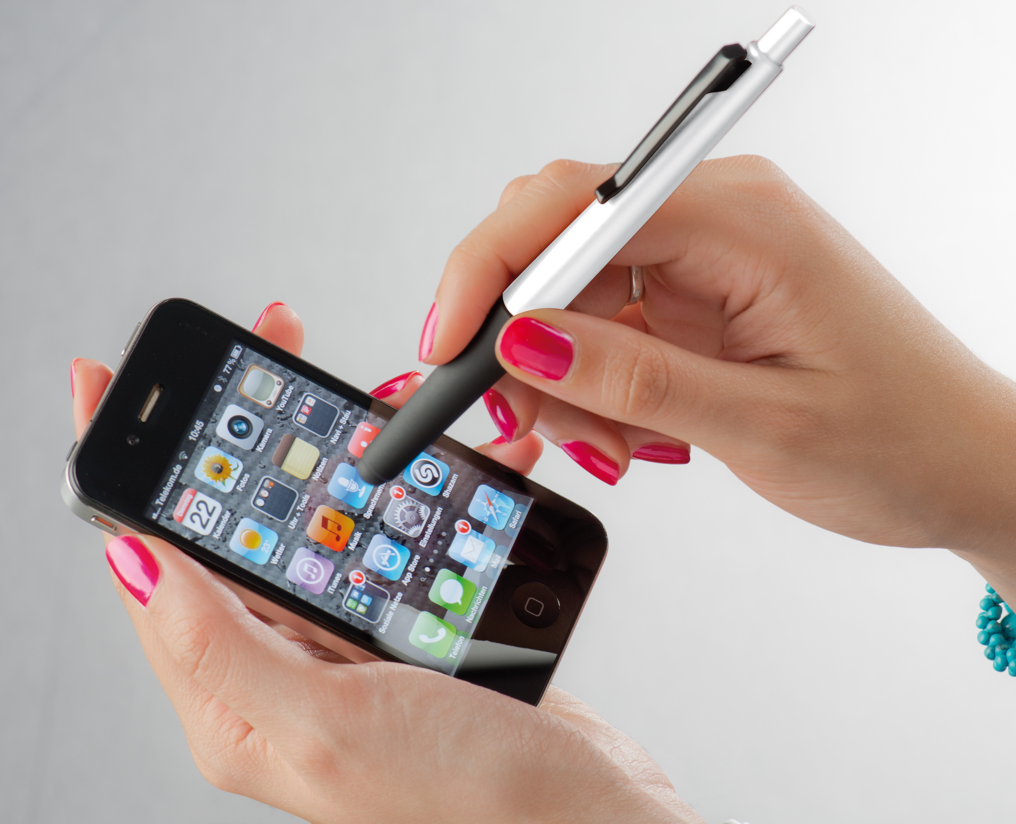 Silver coloured phone holder with flip out base, complete with ballpen/touch pen and gift box.