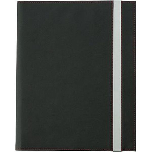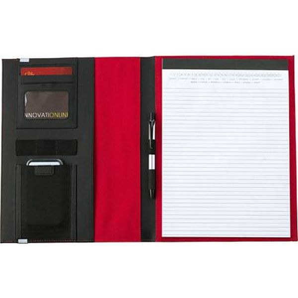 A4 PU portfolio with coloured stitching to match the inside of the folder, includes three card pockets, elasticated pocket and loops and a note pad.