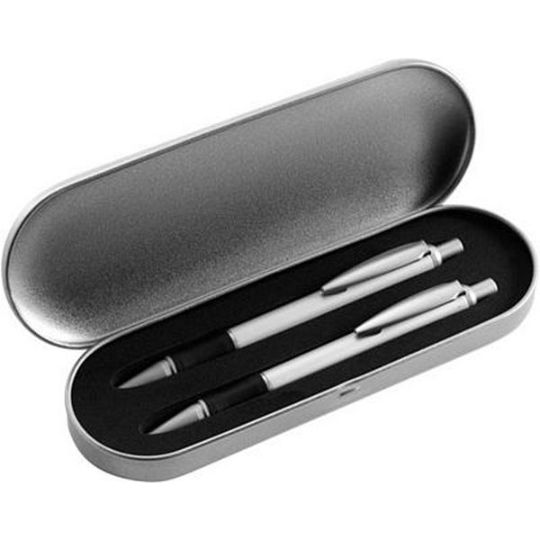 Pen set consisting of a metal ballpen with blue ink and mechanical pencil, supplied in a metal presentation case.