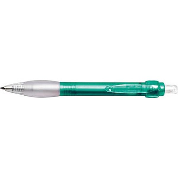 Clear plastic ballpen with rubber grip and translucent clip, blue ink.