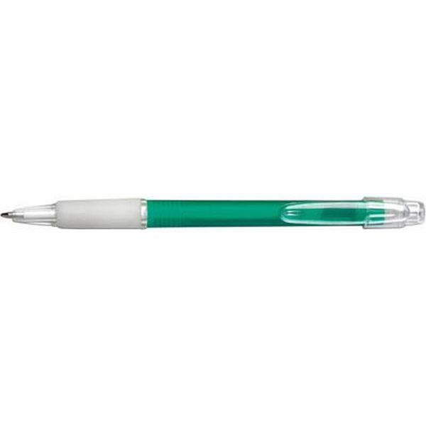 Carmen plastic ballpen with rubber grip, translucent clip and blue ink.