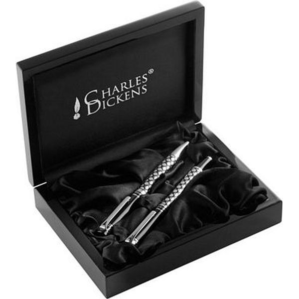 Charles Dickens pen set with a beautifully designed brass ballpen and rollerball with black ink, supplied in a quality Charles Dickens presentation case.