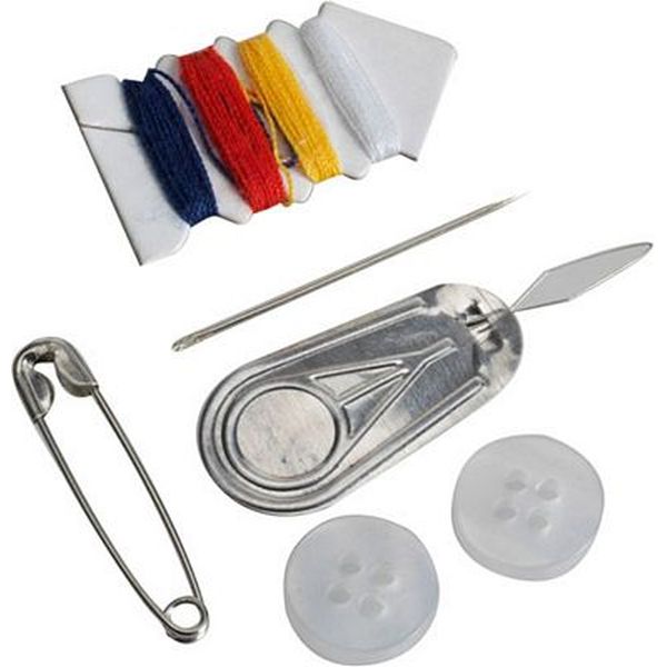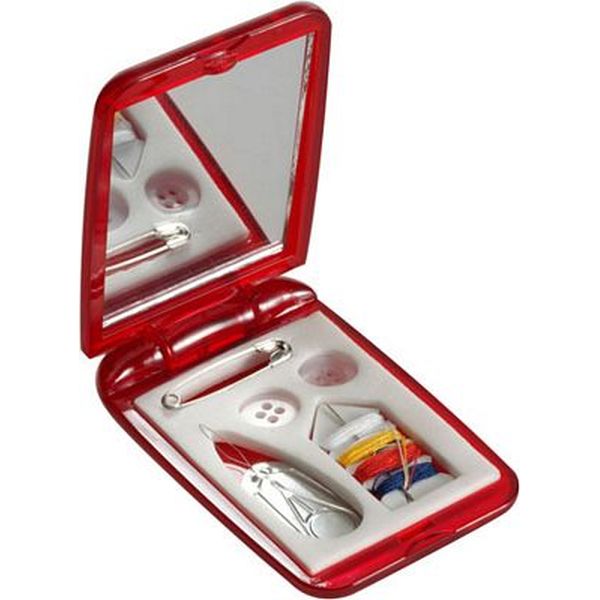Five piece sewing set and mirror in a translucent plastic case, includes a needle, safety pin, cotton, two buttons and a threader