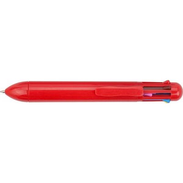 Eight colour plastic ballpen with writing colours, pink, brown, red, green, purple, grey, yellow and light blue.