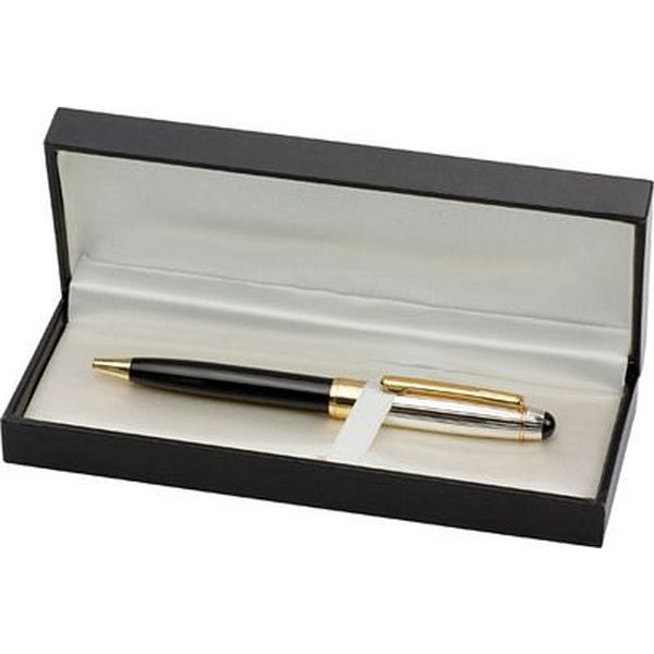 Classical twist action ballpen with black barrel, silver cap and gold trim parts, supplied with black ink and in a presentation box with a white satin inlay.