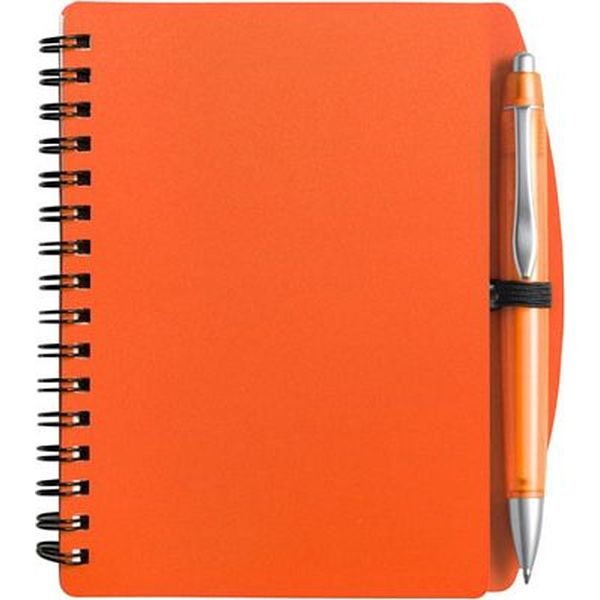 A6 Spiral bound PP covered sixty five page notebook and plastic ballpen with blue ink.